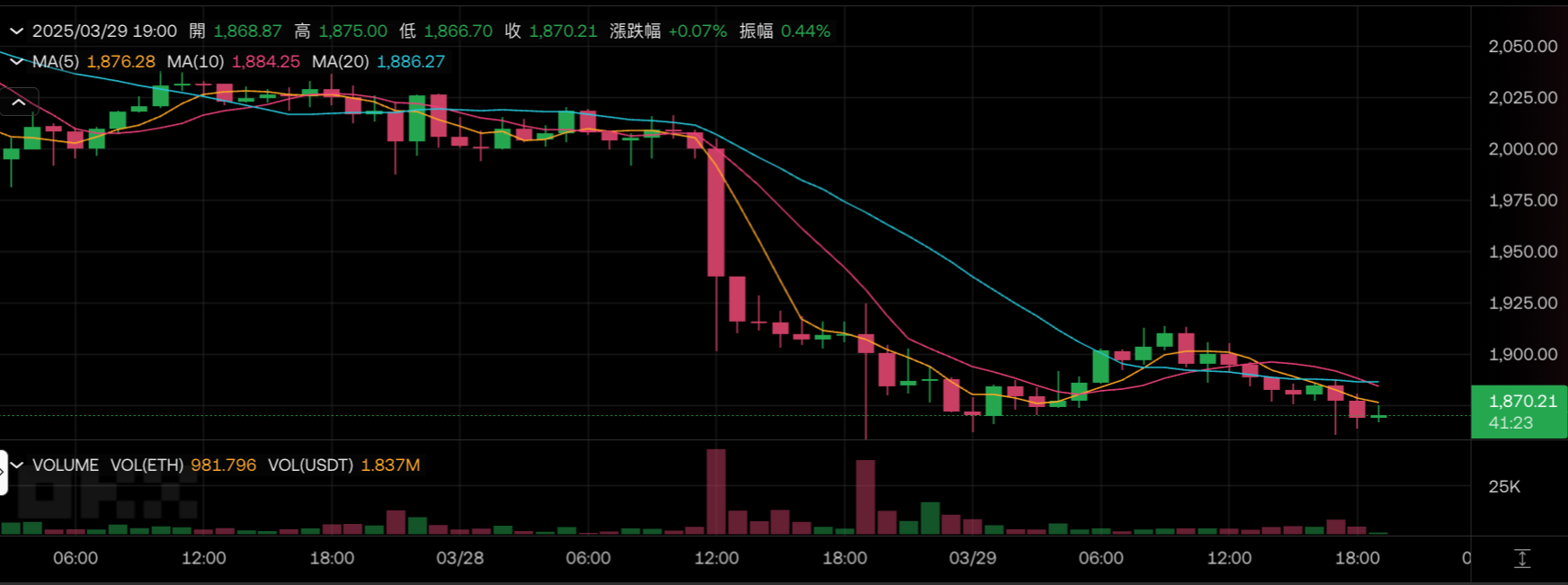 以 太坊(ETH)市场近期面临剧烈波动,昨日跌破 2000 美元大关后,周六(29 日)下午进一步挫低至 1860 美元后持续震盪,撰稿当下来到 1870 美元,近 24 小时跌超 2.1%。
