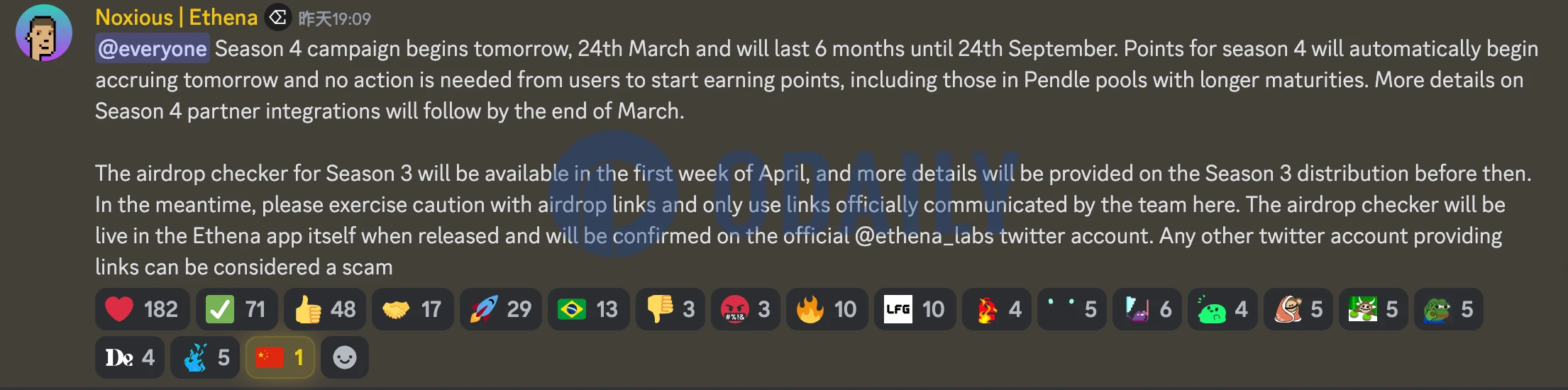 Ethena 团队成员 3 月 24 日在官方 Discord 频道内宣布,Season 3 空投的查询页面将于四月第一周推出,在此之前官方将提供有关 Seaso n3 空投分配的更多详情。
