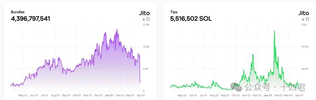 所以累计最近1年发起的总Bundle达43亿笔的规模,而其中产生的总Tips费用达到551万个SOL,按140的市价算,则伴随jito基础设施合计出现77亿美金的额外收益。