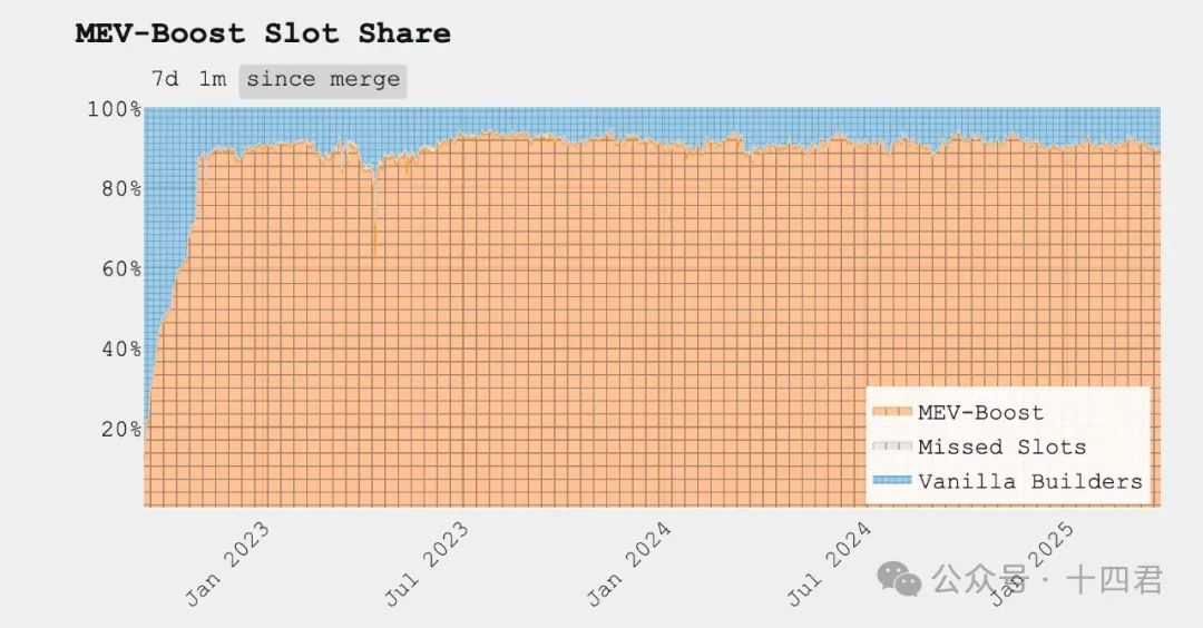 2、矿工激励降低。促使验证者更乐意接受MEV的交易拍卖,在短短的2-3月让MEV达到90%的市占率。