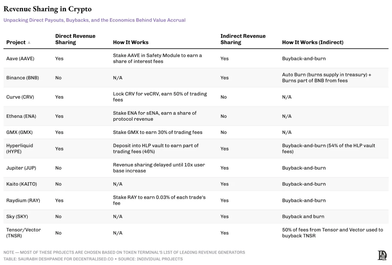 除了这些与代币整合的策略,一些项目采用更直接的收益分享方法,让人联想到传统的公开股权实践。然而,即使是直接收益分享模式,也必须谨慎操作,以避免被归类为证券,在奖励代币持有者与遵守监管规定之间保持平衡。像 Hyperliquid 这样在美国境外的项目,在采用收益分享做法时往往有更大的操作空间。