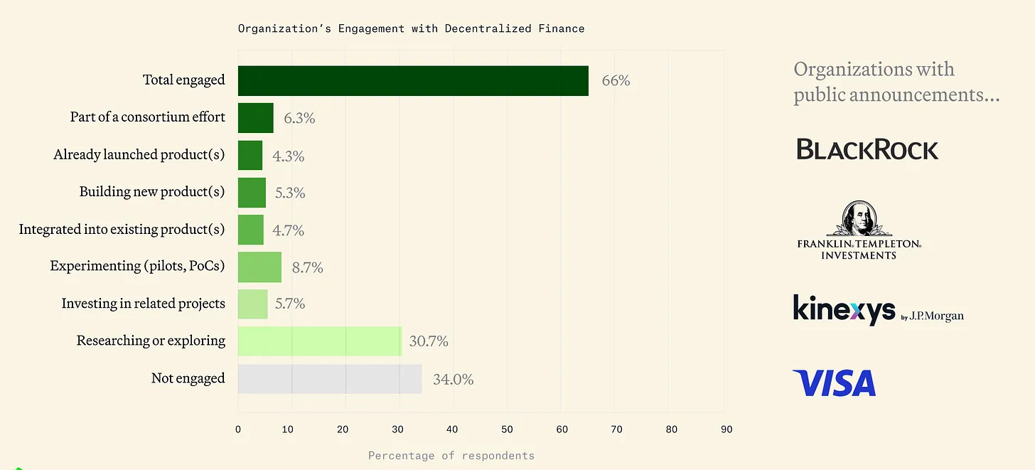约66%的传统金融公司正在与去中心化金融(DeFi)相关联。