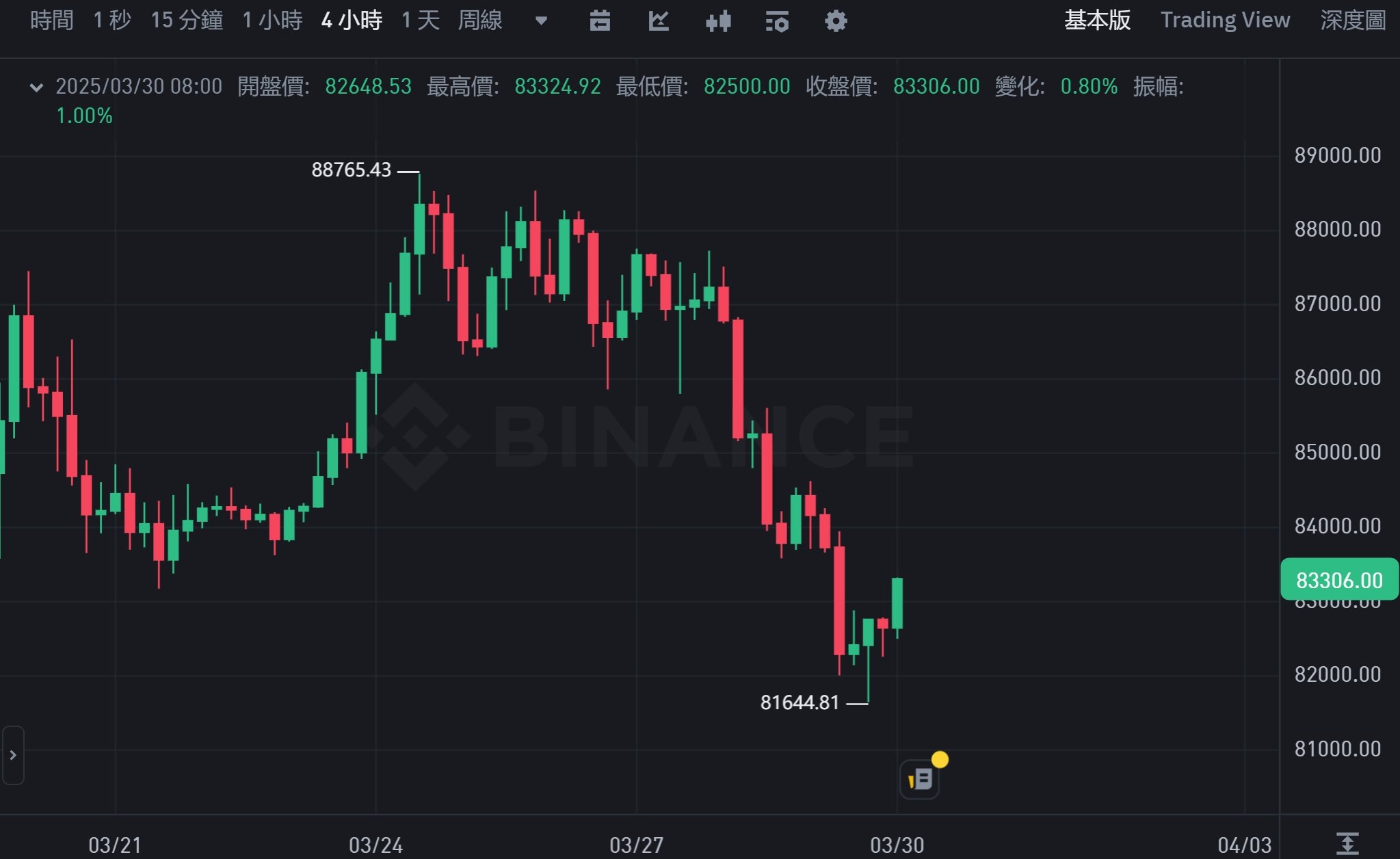 随 著川普政府的对等关税措施将在 4 月 2 日上路,引爆贸易𢧐继续升温的疑虑,再加上美国 2 月个人消费支出物价指数(PCE)意外 升温 ,反映通膨压力仍顽固,在美股崩跌下,比特币也连日持续走跌,在今日最深一度跌至 81644 美元。