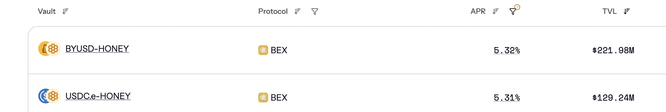 PoL 启动初期, BYUSD/HONEY、 USDC.e/HONEY 这两个最主要的稳定币池 APR 一度超过 20% ,但随着池子规模的扩大以及 BERA 跟着大盘走低,目前 APR 已大幅缩水至 4% 左右。