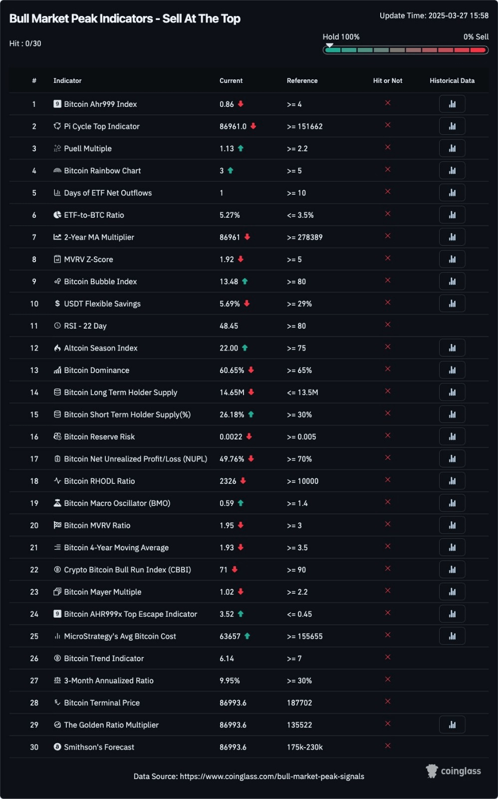 Atlas 认为,这 10 个市场顶部信号一个都没有出现,当下并非本轮牛市终点。而当其中 5 个信号出现时,就可以卖出所有仓位。
