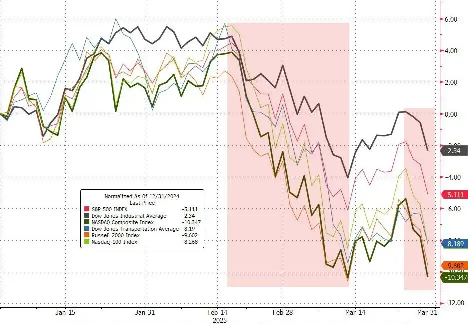 美股的暴跌始于 3 月 28 日「黑色星期五」。据 Investopedia 报道,当日标普 500 指数下跌 112.37 点至 5,580.94 点,纳斯达克指数下跌 481.04 点至 17,322.99 点,道琼斯工业指数下跌 715.80 点至 41,583.90 点。科技股领跌,七大科技巨头(包括苹果、微软、亚马逊等)市值蒸发约 5,050 亿美元,费城半导体指数跌幅达 2.95%。这是自 3 月 10 日美股崩盘以来最大的单日跌幅,标志着 2025 年第一季度末的剧烈调整。