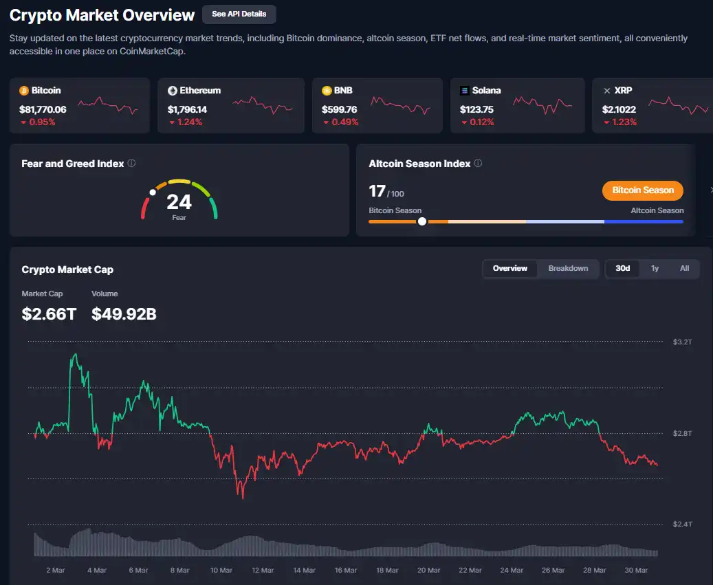 2025 年 3 月末,全球金融市场经历了一场剧烈的动荡。美国股市在 3 月 28 日遭遇「黑色星期五」,标普 500 指数下跌 1.97%,纳斯达克指数暴跌 2.7%,道琼斯工业指数下跌 715 点,跌幅 1.69%。这场跌势迅速波及加密货币市场,比特币(BTC)从 3 月 29 日下午的 84,000 美元下跌至 3 月 31 日早间的 81,565 美元,以太坊(ETH)跌至近期的 1,767 美元新低,Solana(SOL)则在 3 月 30 日 18 时触及 122.68 美元低点。