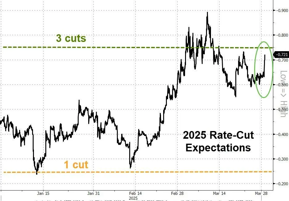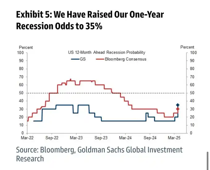 高盛在 3 月 31 日研报中大幅上调 2025 年关税预期,预计平均关税税率上升 15 个百分点,核心 PCE 通胀升至 3.5%,GDP 增长放缓至 1.0%,失业率年底攀升至 4.5%。该行将 12 个月内经济衰退概率提高至 35%,并预计美联储下半年将降息三次以应对增长压力。高盛分析师指出,「消费者和企业情绪疲软,经济进入脆弱阶段,政策风险的影响比近年更大。」