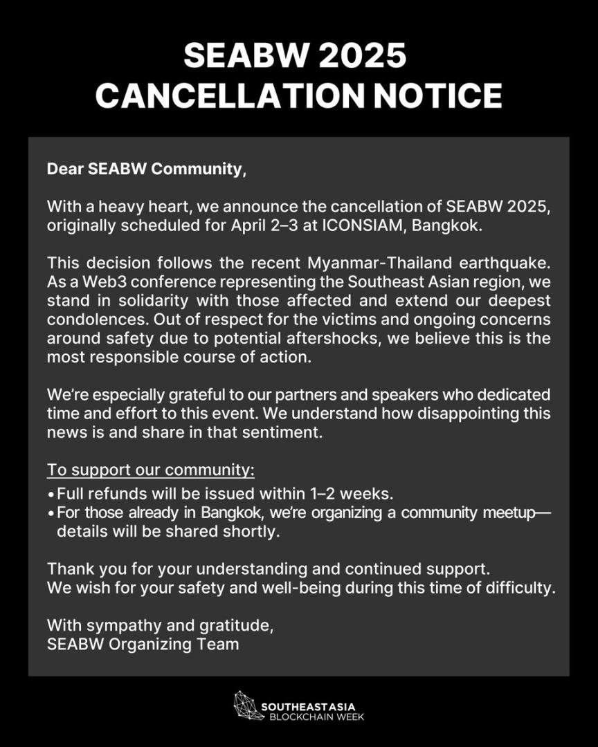 原定于次周(4 月 2 日至 3 日)在曼谷举行的东南亚区块链周(SEABW)也不得不紧急 取消 ,官方表示将使用其渠道帮助受灾民众建立联系,虽然一些周边活动仍计划进行,预计参与人数将大大减少。
