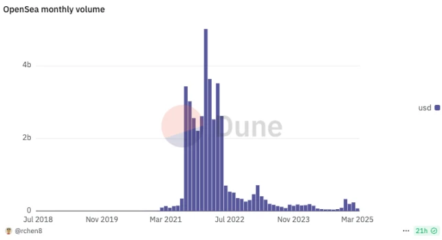 根据 Dune Analytics 的数据, OpenSea 曾主导 NFT 市场,并以 100 亿美元的估值获得投资机会, 2022 年初交易额峰值甚至接近月 50 亿美元,成为 NFT 繁荣期的象征。