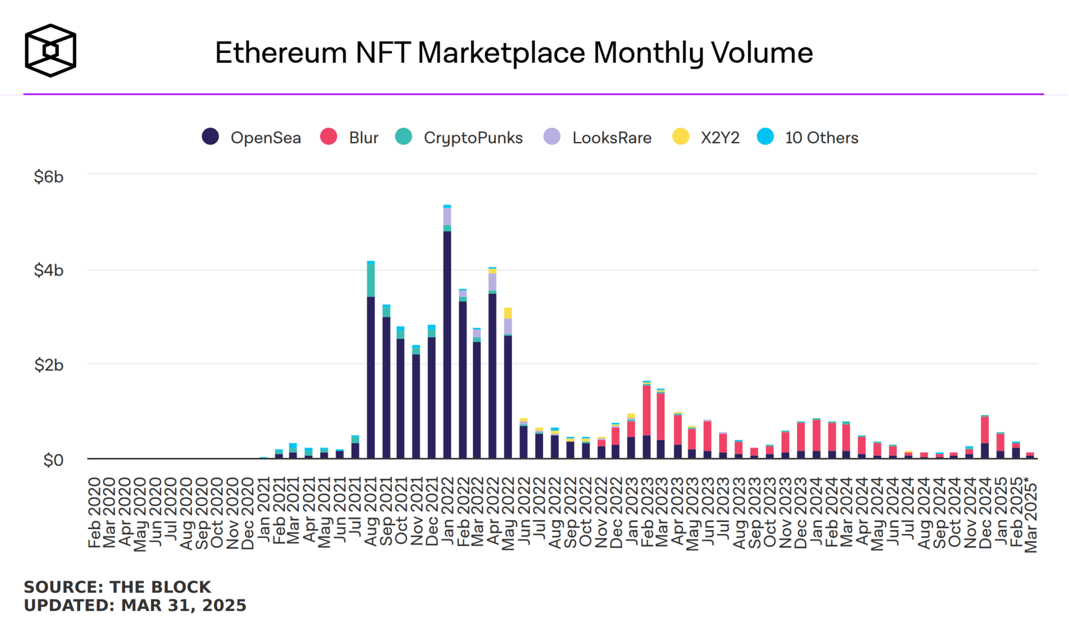 X2Y2 的衰落并非孤例,而是整个 NFT 行业低迷的缩影。根据 The Block 的数据,由于主要平台活动的普遍萎缩,今年 3 月基于以太坊的 NFT 月交易量几乎跌至近年来的最低点。OpenSea、Blur、LooksRare 和 X2Y2 等主要市场的活跃度持续下降,进一步印证了 NFT 行业正面临严峻挑战。
