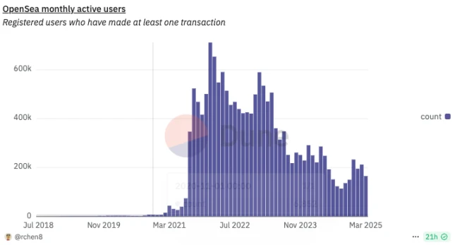 2023 年后,OpenSea 的交易额明显缩水,用户和资金大幅流失,市场占有率明显下滑。市场逐渐进入理性甚至过冷阶段。3 月,OpenSea 活跃用户下降 22% ,至 16.5 万。
