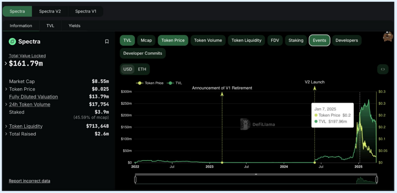 Spectra 采取了不同的方法——战略性、分阶段推出,而不是高调的发布。在 2024 年 6 月重新推出有规划的收益市场后,最初采用率并不高。但这种情况在 2024 年 12 月发生变化,当时 Spectra 的 TVL 在短短几周内从 2000 万美元跃升至 1.9 亿美元以上。