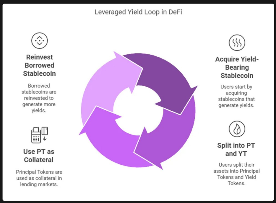 铸造稳定币 → 拆分为 PT / YT → 使用 PT 作为抵押品 → 借入 → 循环往复。