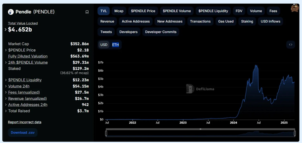 即使到了 2025 年初,当 Pendle 的 TVL 在 35 亿美元和 50 亿美元之间波动时,代币仍保持在几美元的范围内。这表明市场仍在定价未来的上行空间,而不仅仅是当前的 TVL。