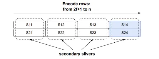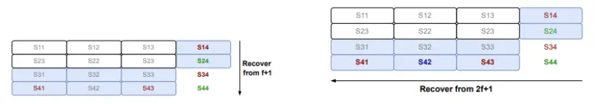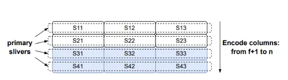 (b) 二维次级编码 。文件被拆分成2f + 1列和f + 1行。每一行被编码为一个独立的blob,包含 f 个修复符号。然后,每一列的扩展部分就是相应节点的次级片段。