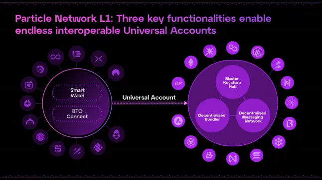 Particle Network通过其通用账户 (Universal Accounts)和三个核心功能,在高性能的EVM执行环境中协调并完成跨链交易: