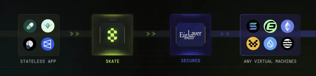 Skate 是专注于DAPP的基础设施层,允许用户通过连接到所有虚拟机(EVM、TonVM、SolanaVM)无缝地与其原生链进行交互。对于用户,Skate提供可以在其首选环境中运行的应用。对于开发者,Skate管理跨链的复杂性,并引入一种新的应用程序范式,使得应用可以在所有链和所有虚拟机上构建,并使用一个统一的应用状态来服务所有链。