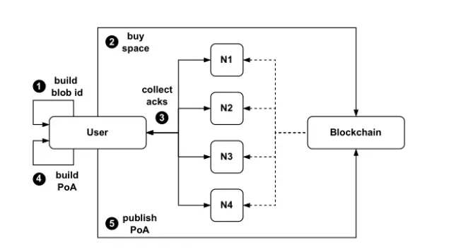 接着,W将所有片段的承诺发送给每个节点,并附带相应的片段对。各个节点检查自己在片段对中的片段是否与承诺一致,重新计算blob的承诺,并回复签名确认。当收集到2f + 1个签名后,W生成一个证书,并将其发布到链上,以证明该blob将是可用的。