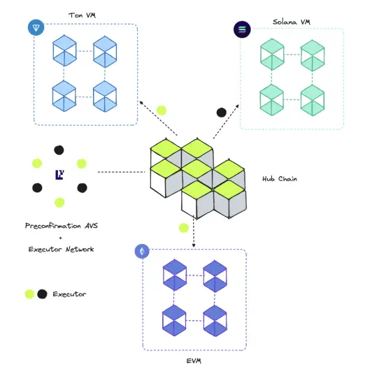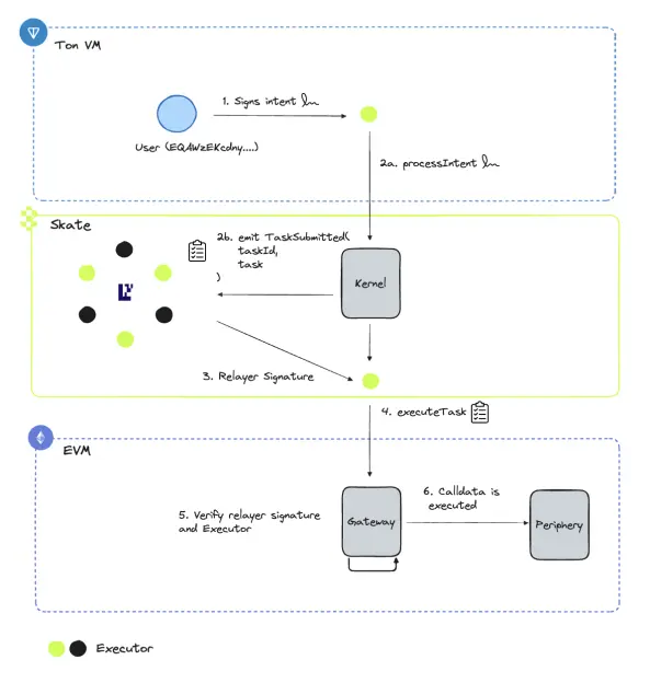 作为中心链,Skate维护并更新共享状态,为连接的外围链提供指令,这些外围链只会响应Skate提供的调用数据。这一过程通过我们的执行者网络实现,其中每个执行者都是注册的AVS操作员,负责执行这些任务。如果出现不诚实行为,我们可以依赖预确认AVS作为真实数据源来惩罚违规操作员。
