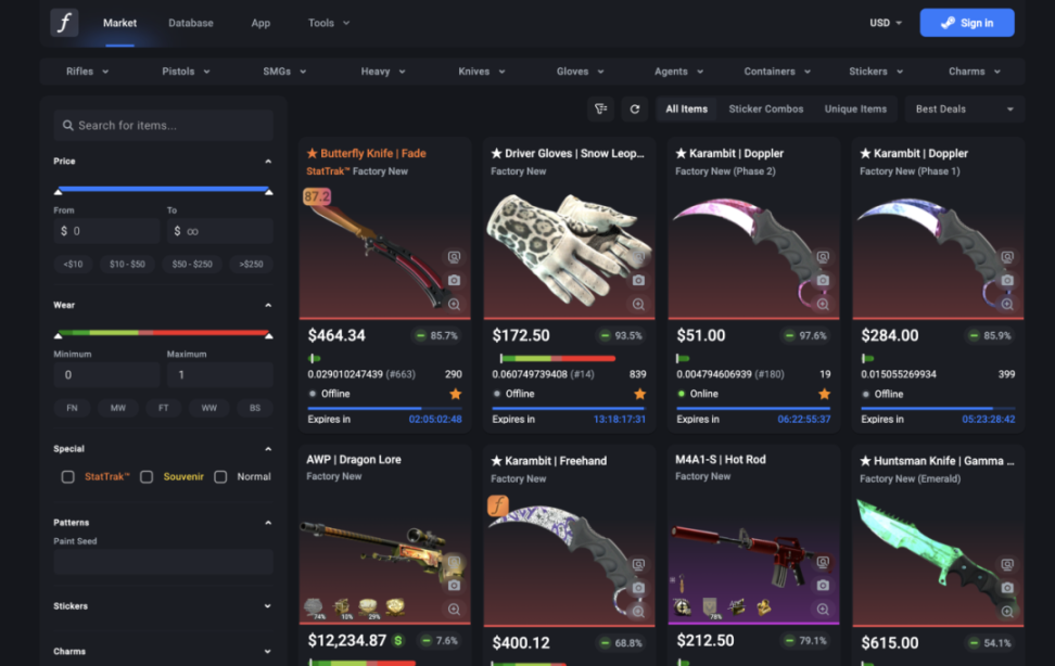 - CSFloat (csfloat.com) 让用户通过 Steam 数据验证《反恐精英》皮肤和收藏品的所有权,实现安全的点对点交易,无需平台介入。