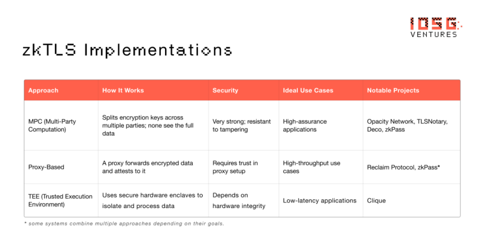 并非所有的 zkTLS 实现都是相同的。根据最重要的因素 —— 速度、去中心化或简单性 —— 不同的方法在不同的上下文中表现出色。以下是三种常见的架构: