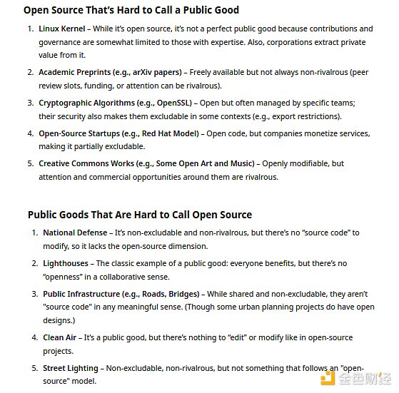 那么「开源」和「公共物品」之间有什么区别呢?好吧,我们可以先让机器人举几个例子: