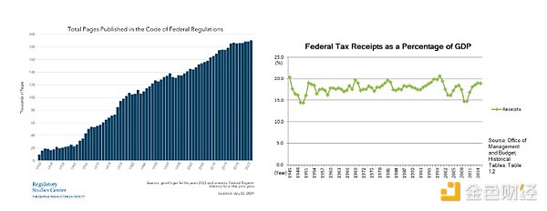 在我成长的过程中,经常让我感到困惑的一件事是,人们经常重复声称我们生活在一个高度重视「放松管制」的「深度新自由主义社会」。我感到困惑,因为虽然我看到相当多的人主张新自由主义和放松管制,但总体而言,政府监管的实际状况与任何可以反映这些价值观的监管都非常不同。联邦法规的总数一直在不断增加。KYC、版权、机场安检和各种其他规则都在不断收紧。自二战以来,美国联邦税收占 GDP 的百分比大致保持不变。