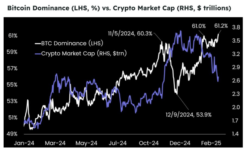 然而,市场结构仍对比特币有利。尽管加密货币总市值大幅下跌,但比特币的主导地位已攀升至61%以上,这表明在宏观不确定性加剧的环境下,资金正从风险更高的山寨币轮动至比特币。以太坊、Solana等山寨币较周期高点已下跌35%-50%,这进一步强化了比特币作为加密市场“储备资产”的地位。