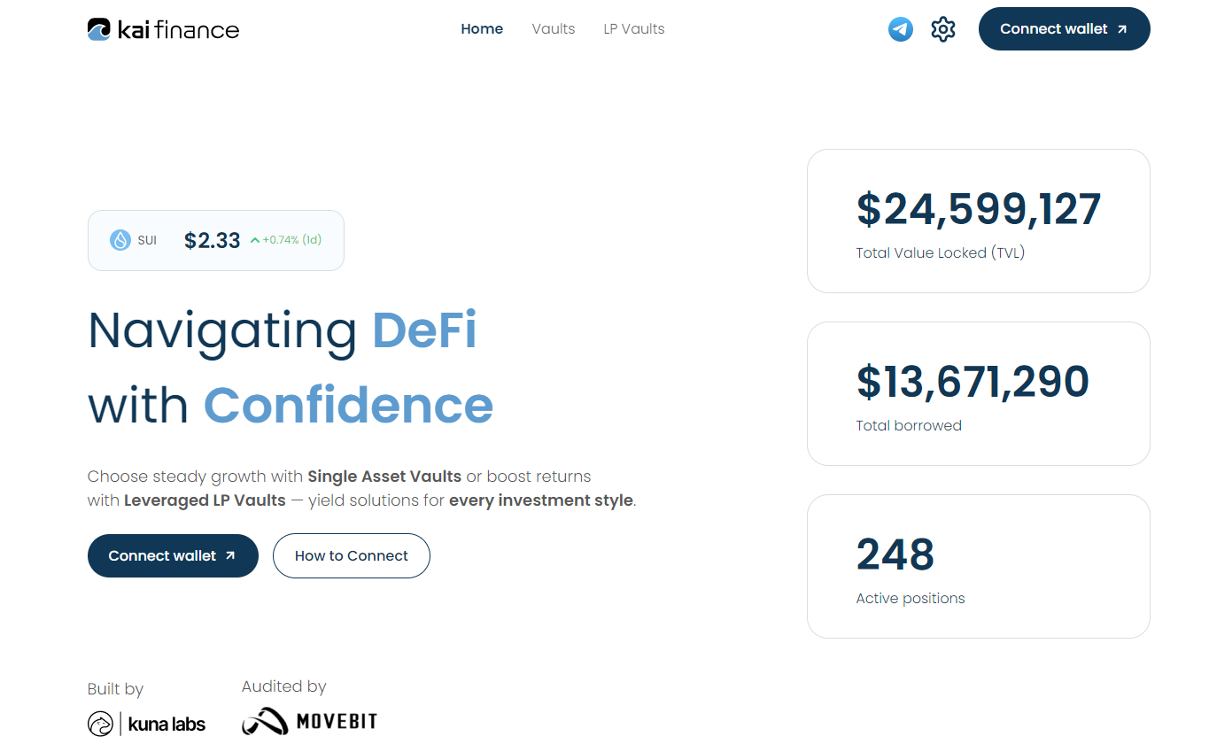 - Kai Finance是构建在Sui区块链上的新一代DeFi平台,为借贷、质押和收益生成提供无缝衔接的金融解决方案。