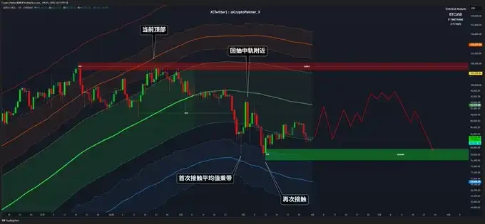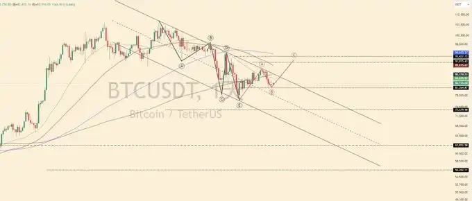 2、如果把从 109000 → 76000 的下跌看做是整个下跌的第一阶段的话,认为 76000 至今的反弹是没有走完整的,如图所示: