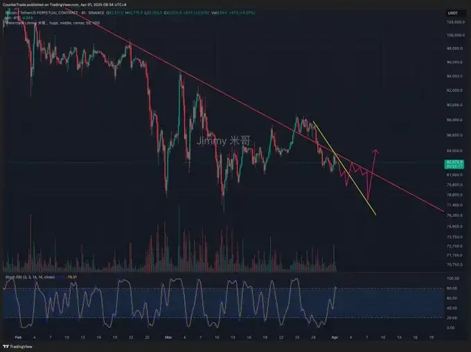 BTC 短期继续下降趋势, 4 小时图上出现 83000 压力位的假突破诱多,现在又跌回去了。小周期预计去 79.5 形成第一个底,然后周三关税落地后反弹,让大家觉得该涨了,再出现底中底在 78 k。走势参考图下面的图。