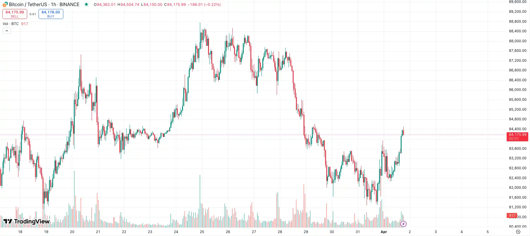 传导至币圈,比特币从 3 月 29 日下午 84, 000 美元下跌 8 小时至 81, 644 美元,跌幅超 3% ,随后在 3 月 30 日 18 时反弹至 83, 536 美元,但未能守住涨势,至 3 月 31 日 6 时跌至 81, 565 美元。加密货币总市值从峰值 3.9 万亿美元回落至 2.9 万亿美元,跌幅 25% ,交易量从 11 月 5 日大选后的 1, 260 亿美元降至 350 亿美元,萎缩约 70% 。