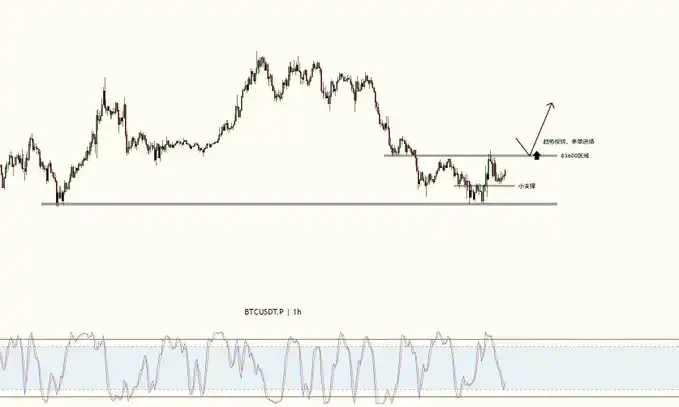 目前 1 H 整体还是个下跌箱体,但箱体中有个短期结构的反转,配合指标上穿,先重新看向 83600 区域,观察继续受阻的情况。