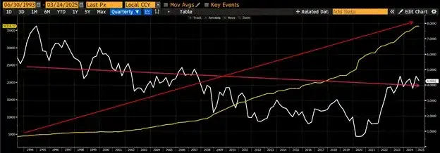 然而,对于投资者而言,关键在于摒弃对政策「对错」的主观判断,转而关注概率和数学模型。投资组合的表现更多取决于全球范围内法定货币流动性的变化,而非美国相较其他国家的强弱。因此,与其试图猜测特朗普的政策倾向,不如专注于相关数据图表和数学关系,以更好地把握市场动向。