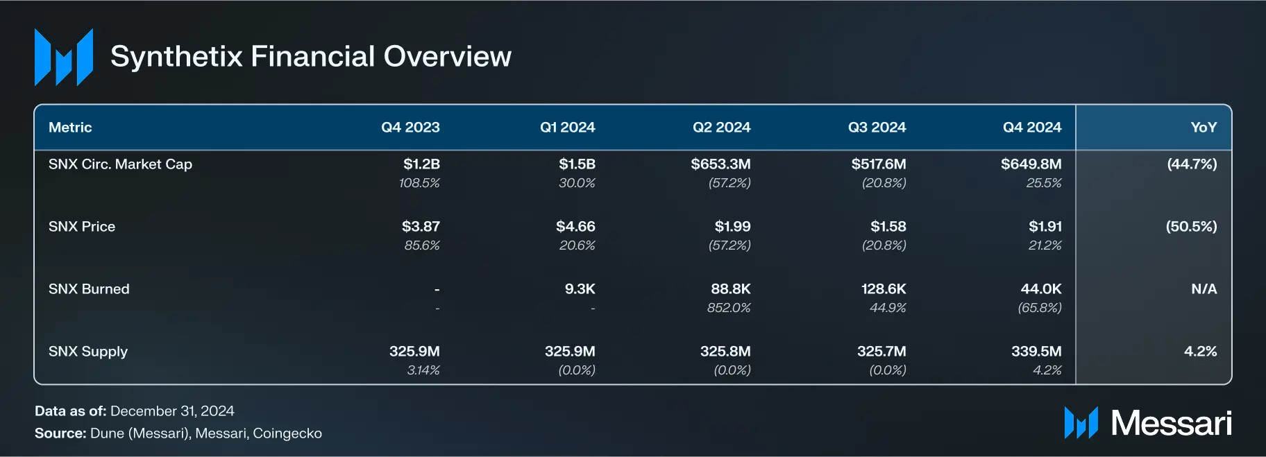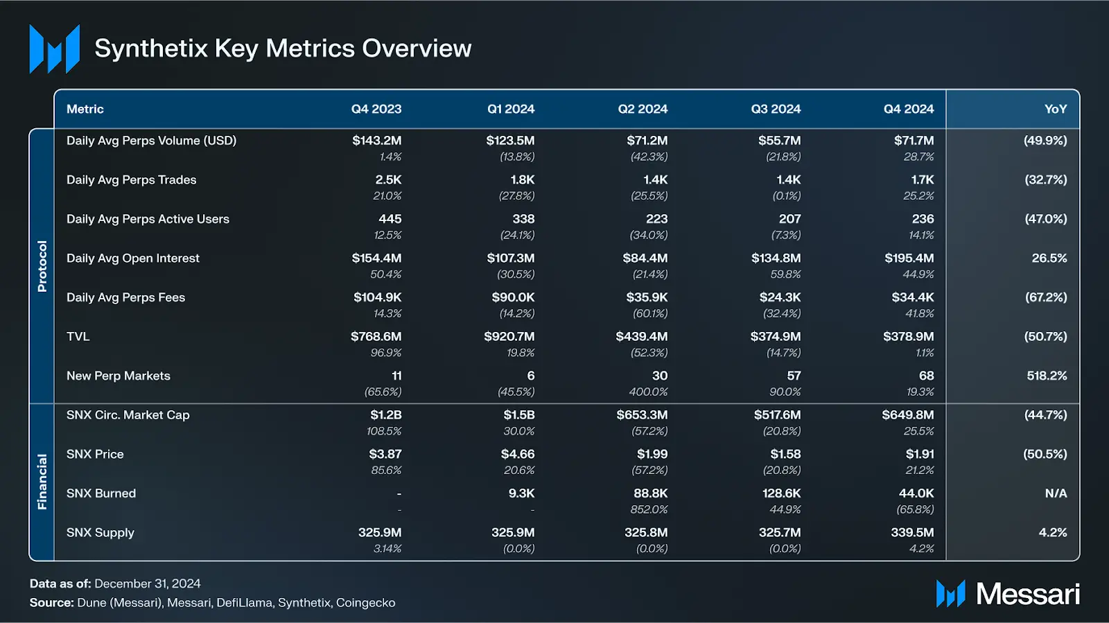 本文为对 Synthetix 2024 年第四季度表现的整理与分析,内容基于 Messari 发布的原始材料编译而成,涵盖其在治理结构、产品布局、交易活跃度、市场数据和财务状况等方面的主要进展。