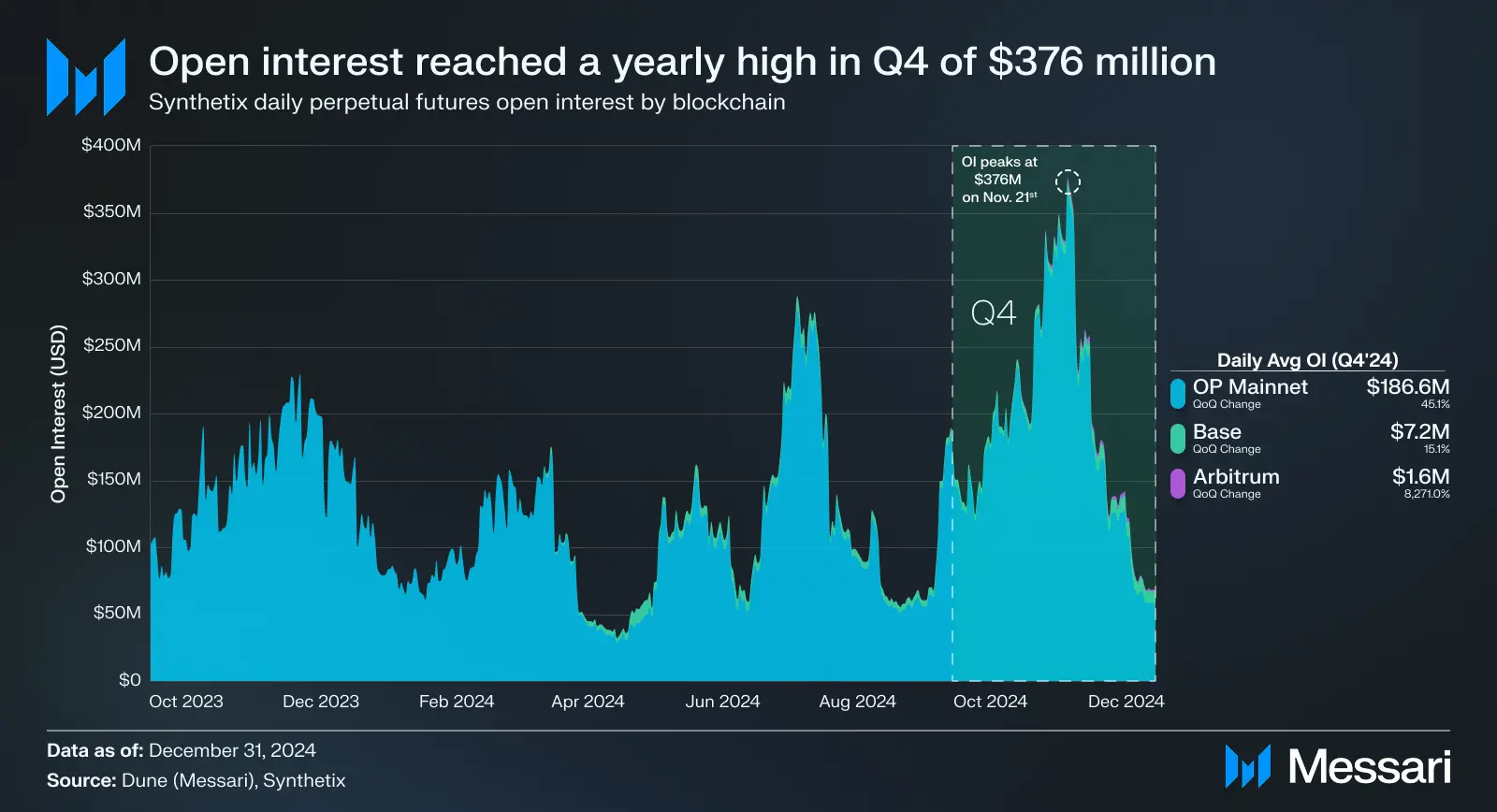 截至第四季度末,Synthetix 的 OI 为 6750 万美元,环比下降 60%(Q3 为 1.667 亿美元)。不过,在 11 月 21 日,由于市场波动加剧,OI 创下了 历史新高(ATH),达到 3.761 亿美元。整个第四季度的日均 OI 为 1.954 亿美元,环比增长 45%,高于上一季度的 1.348 亿美元。OI 在美国总统大选前呈现上升趋势,11 月 5 日(大选当日)OI 达到 2.089 亿美元。随着唐纳德·特朗普的当选,加密市场迎来一轮上涨行情。在价格上涨的同时,投资者的风险偏好也随之提升,推动了杠杆交易的活跃度,并带动未平仓合约持续上升。