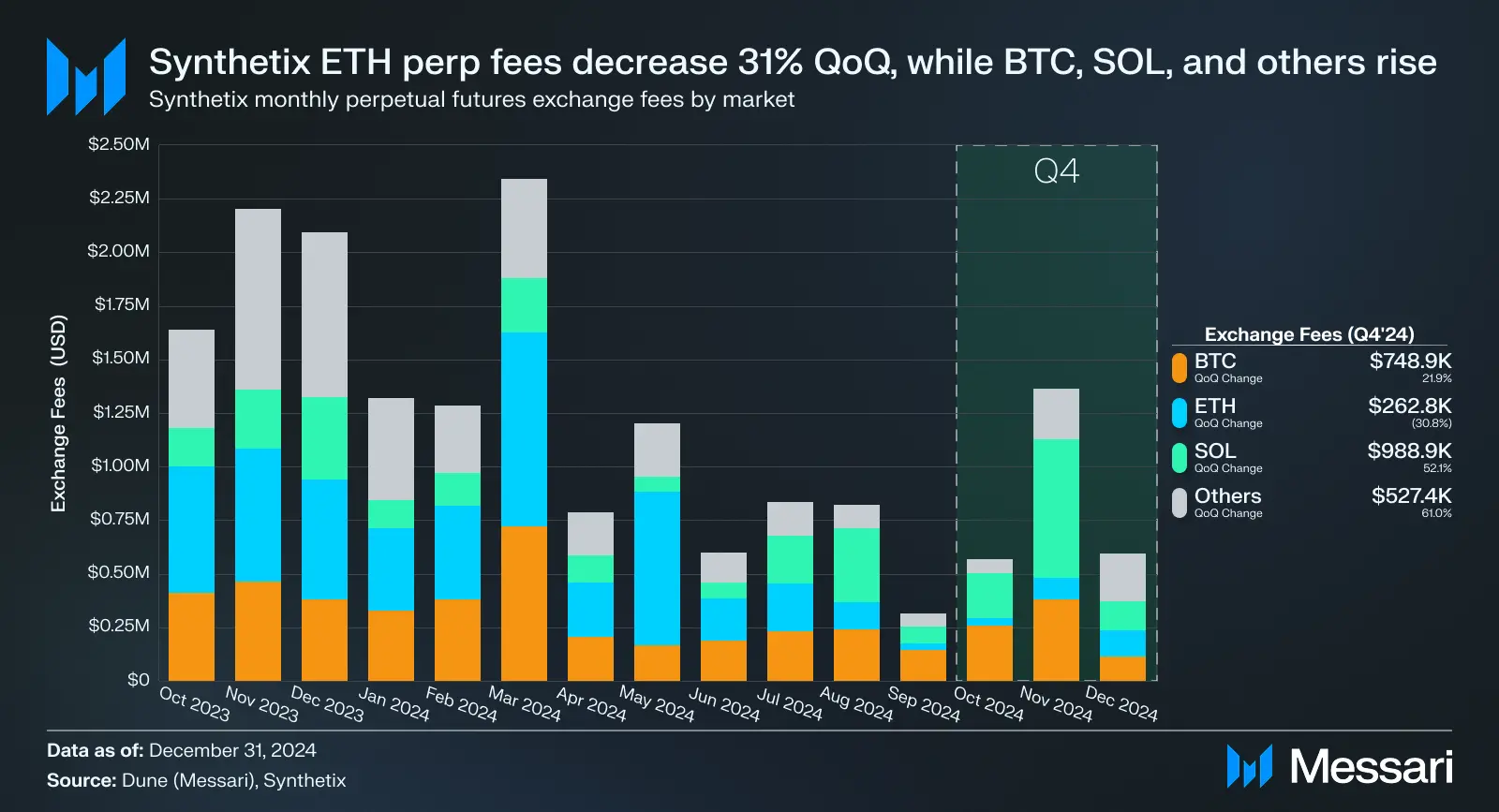 若仅观察永续合约的交易手续费(perp exchange fees):SOL 永续合约市场在第四季度创收最高,交易手续费达 988,900 美元,环比增长 52%。BTC 永续合约市场以 748,900 美元位列第二,环比增长 22%。与此同时,ETH 的交易手续费环比下降 31%,反映出 Synthetix 的 perp 用户在第四季度逐渐偏好交易其他资产市场。