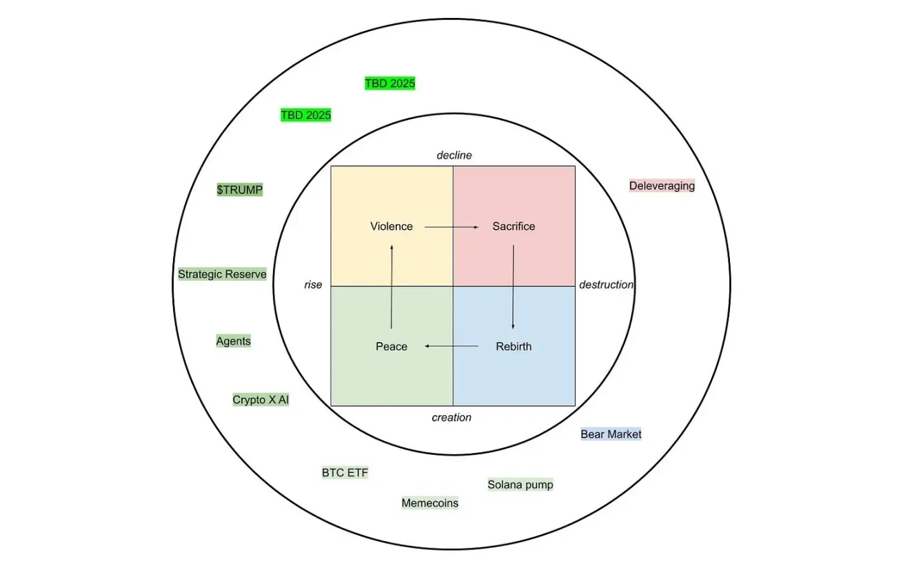 但特朗普在 2025 年 1 月的就职带来了焦虑。在贸易战的负面传闻和宏观经济动荡中,人们对政府会像神明般干预市场的期望落空了。加密社区意识到,作为顶级影响力人物的特朗普,用他自己的 Meme 代币摧毁了市场,突然结束了 Meme 代币的超级周期。第一幕就此结束,社区指望着机构来拯救他们,但此时还看不到替罪羊的身影。