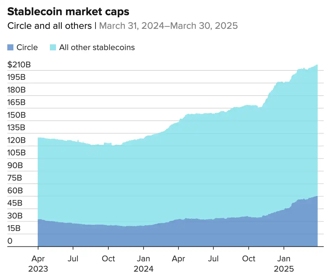 USDC 是 Circle 最知名的产品,这是全球第二大稳定币。USDC 在上一轮加密牛市中迅速崛起,市值从 2020 年的不到 10 亿美元飙升至 2022 年的超 500 亿美元, 2024 年进一步增长至 601 亿美元,占整个稳定币市场的 26% 。尽管龙头 Tether(USDT)仍以 67% 的市占率遥遥领先,但 USDC 今年增长迅猛——市值增长了 36% ,而 Tether 只有 5% 。