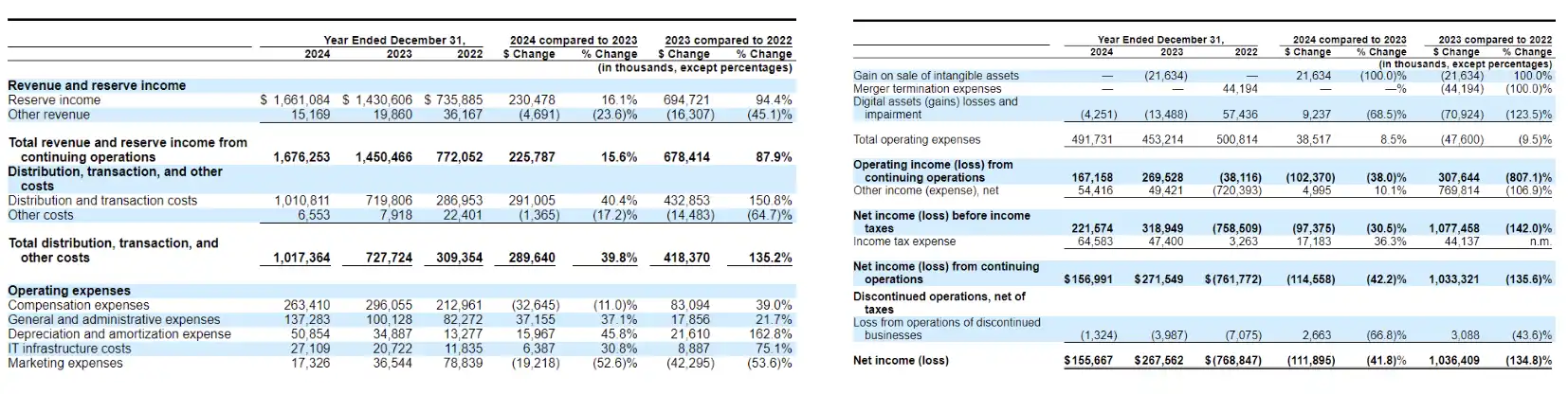 2024 年年度的分销和交易成本相较于 2023 年底增加了 2.91 亿美元(40.4%),主要原因是支付给 Coinbase 的分销成本增加了 2.166 亿美元,以及与新的战略分销伙伴关系相关的其他分销激励成本增加了 7,410 万美元,如向币安支付的预付一次性费用。2024 年度其他费用与 2023 年度相比减少了 140 万美元(17.2%),主要原因是公司停用传统交易服务产品,相关费用减少了 90 万美元。