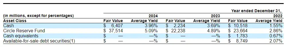 在现金流方面,2022-2024 年连续三年,存放在银行账户中的 USDC 储备现金余额远远超过了每个金融机构 25 万美元的 FDIC 保险限额。截至 2024 年 12 月 31 日,约 85% 的 USDC 储备存放在 Circle 储备基金中,其余部分则以现金形式存放于若干银行账户中。Circle 储备基金由贝莱德管理。该基金仅对 Circle 可用,且 Circle 是 Circle 储备基金的唯一股东。