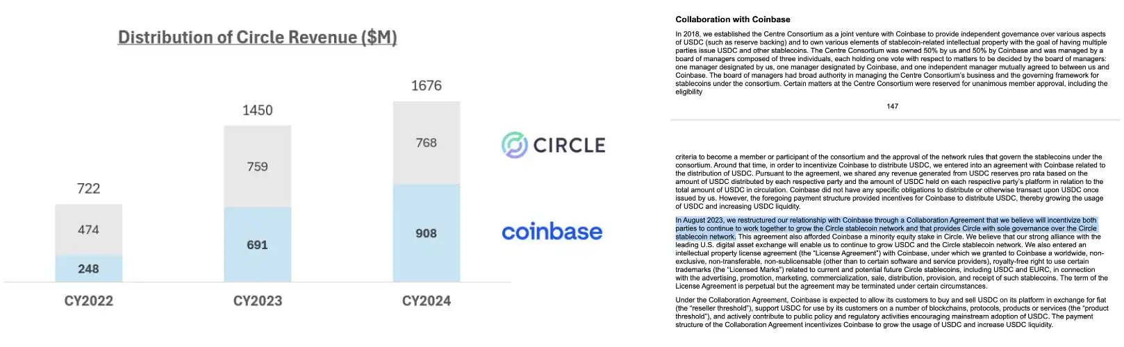 Circle 深知 USDC 的成功离不开生态支持。最初,它与 Coinbase 通过 Centre 联盟共同发行 USDC,但 2023 年联盟解散,Circle 全权接管。S-1 披露,Coinbase 如今持有 Circle 少数股权,双方基于储备总收入更平均地分配利润(仍按各自钱包和托管产品中的 USDC 持有量划分)。Circle 在 2024 年赚取了约 17 亿美元的收入,并作为分销合作伙伴向 Coinbase 支付了超 9 亿美元。