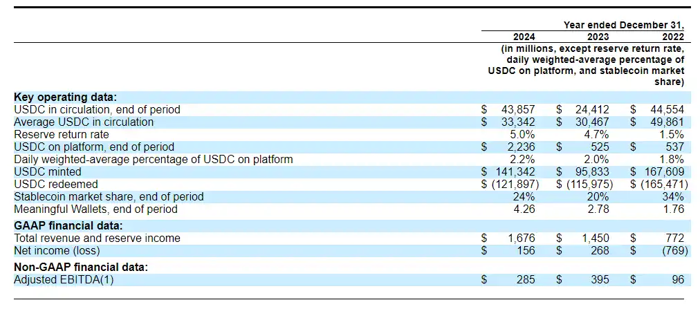 截至 2024 年 12 月 31 日,USDC 已用于约 20 万亿美元的链上交易。下表列示了在所述期间的关键运营和财务指标,以及相关的 GAAP(美国公认会计准则)度量标准: