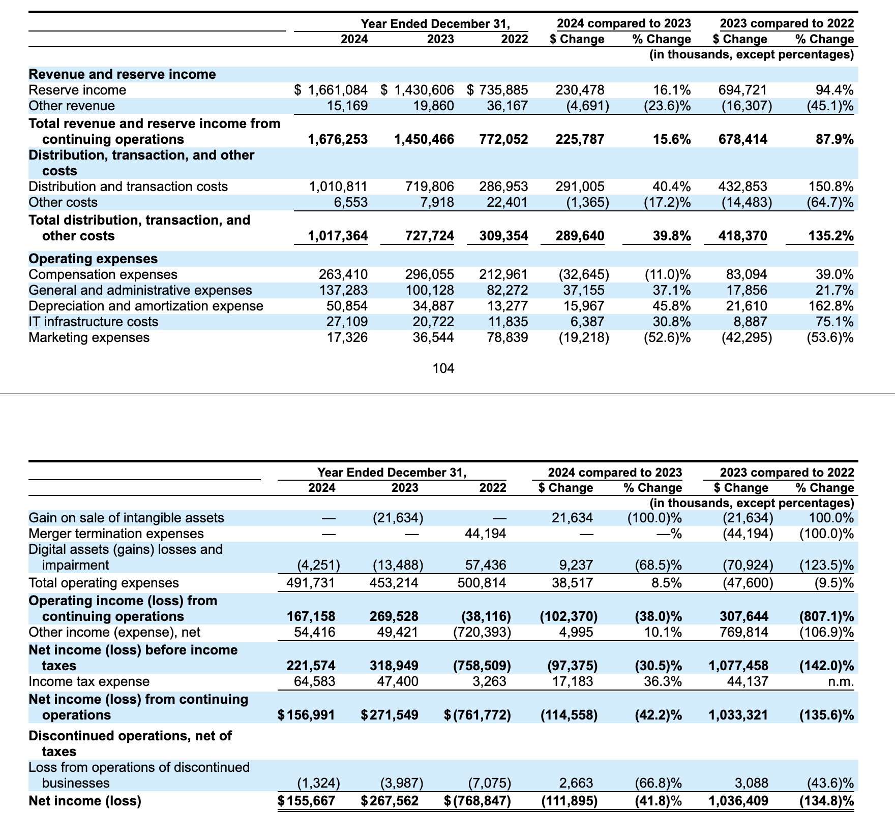 其次,高昂的分销成本进一步侵蚀了Circle的利润。2024年Circle的净利润为1.5567亿美元,相比2023年下降了41.8%。这一数字下降背后是分销和交易成本的大幅上升,2024年Circle共花费10.108亿美元,占总收入的60.7% , 相比2023年增长40.4%。其中,Coinbase为USDC的主要分发平台。据Coinbase此前财报披露,仅在2024年Q4,Coinbase就从USDC获得2.259亿美元收入,全年预计将获得约9亿美元。这意味着Circle正花费更多资金来维持USDC生态系统的流通,但收入增长未能同步跟上。