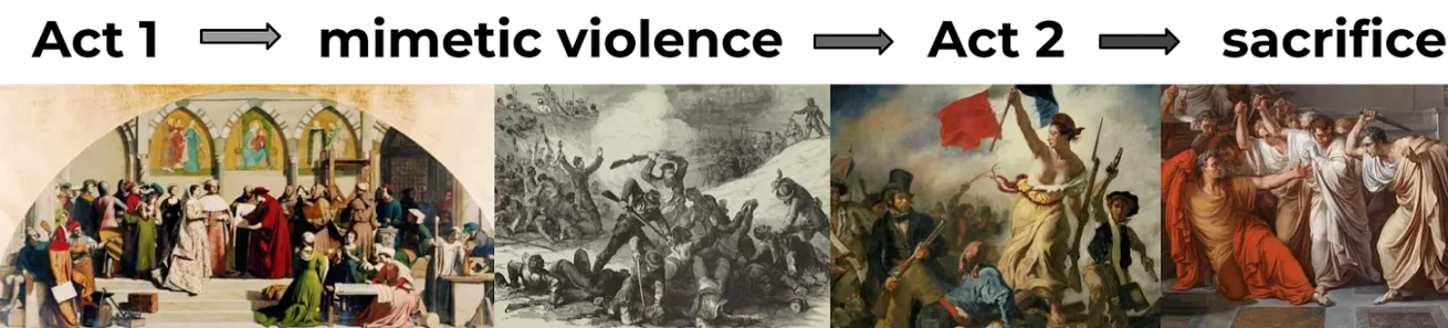 从吉拉尔的理论视角来看,这些插曲是转折点:第一幕中占主导地位的参与者因不可持续的过度繁荣而崩溃,引发了内部冲突,直到第二幕将人们的欲望重新导向新的资产,从而推迟了最终的牺牲危机。