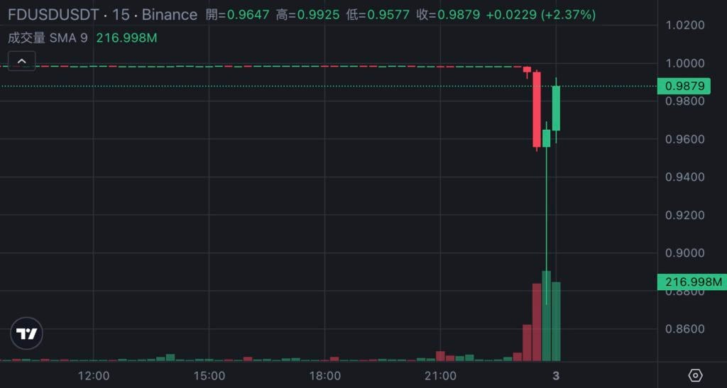 消息出来后 FDUSD 一度大幅脱钩跌至 0.87 美元,截稿前报 0.95 美元,动区将为您持续追踪。