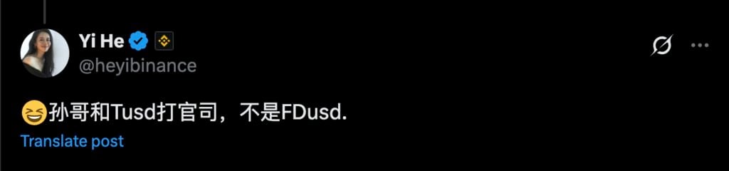 或受 Binance 币安共同创办人何一在社群媒体上表示:「Justin Sun 和 TUSD 打官司,不是 FDUSD」,FDUSD 大幅反弹