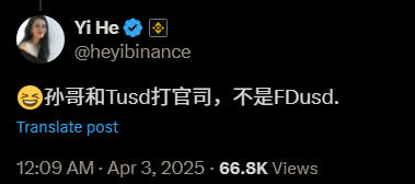 此番言论也导致 FDUSD 短时脱锚至 0.88 USDT 附近,BTC/FDUSD 交易对价格一度飙升至近 10 万。FDUSD 的持有者疯狂出逃,与 2022 年 USDC 因硅谷银行倒闭而脱锚时的情景如出一辙。随即 何一发推 澄清孙宇晨是围绕 TUSD 而非 FDUSD 发起诉讼后,FDUSD 价格迅速回锚至 0.99 USDT 附近。
