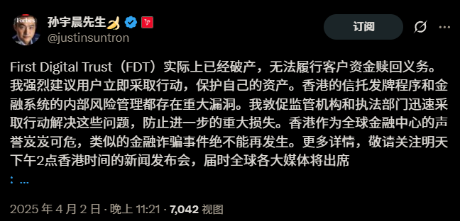 就在该报道发出后不久,孙宇晨发推称,First Digital Trust (FDT)实际上已经破产,无法履行客户资金赎回义务,强烈建议用户立即采取行动,保护自己的资产敦促监管机构和执法部门迅速采取行动解决这些问题,防止进一步的重大损失。并将于 4 月 3 日 14:00 在香港召开新闻发布会。